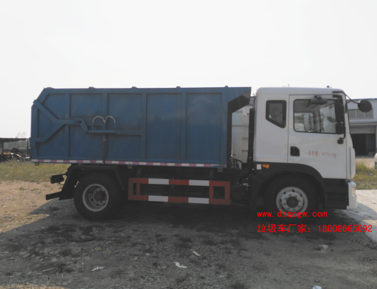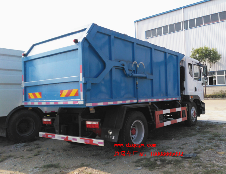 卸料結構:系用箱卸料,由兩只液壓油缸直接舉升車廂進行卸料,箱底與地面夾角不小于45度,以實現垃圾依靠自重能自行卸下的專用自卸運輸車。