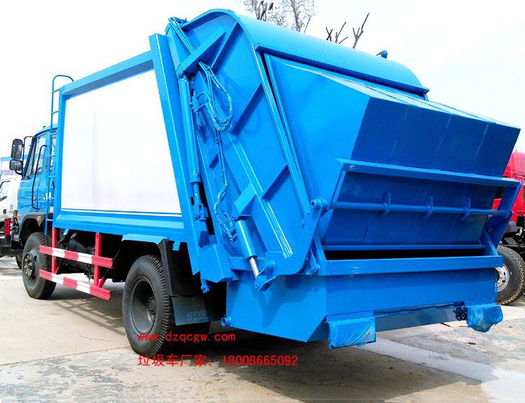 上裝說明: 廂體材料為武鋼優質炭鋼,厚度為邊5mm,廂體容積為8-10立方米。由裝料機構、壓縮機構、卸料機構、油泵、油箱、控制閥等組成的液壓機構組成。裝料機構由支架、連桿機構、凸輪、掛鉤等組成,在油缸作用下,將垃圾桶內的垃圾自動翻轉倒入料斗內。新款有9支液壓缸制動,不帶副壓板,液壓控制操作系統為電動控制和手動控制。