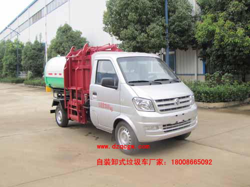 組成部分:上裝部分由密封式垃圾廂、液壓系統、操作系統組成。舉升油制缸(2支)垃圾廂可自吊上放下,上下一次工作循環時間≤50S。該掛桶式垃圾車的 特點是一個車能配幾十個垃圾廂,能實現一臺車與多個垃圾廂聯合作業,循環運輸,充分提高了車輛的運輸能力,特別適用于短途運輸,如環衛部門對城鎮垃圾的清 理、運輸等。